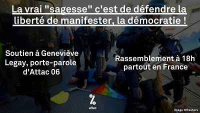 Geneviève Legay, 74 ans, porte-parole d’Attac 06 et militante infatigable pour la paix, a été grièvement blessée par une charge policière, lors de l’acte 19 des Gilets Jaunes ce samedi 23 mars à Nice. Selon son avocat, elle serait ce matin dans un état stable.